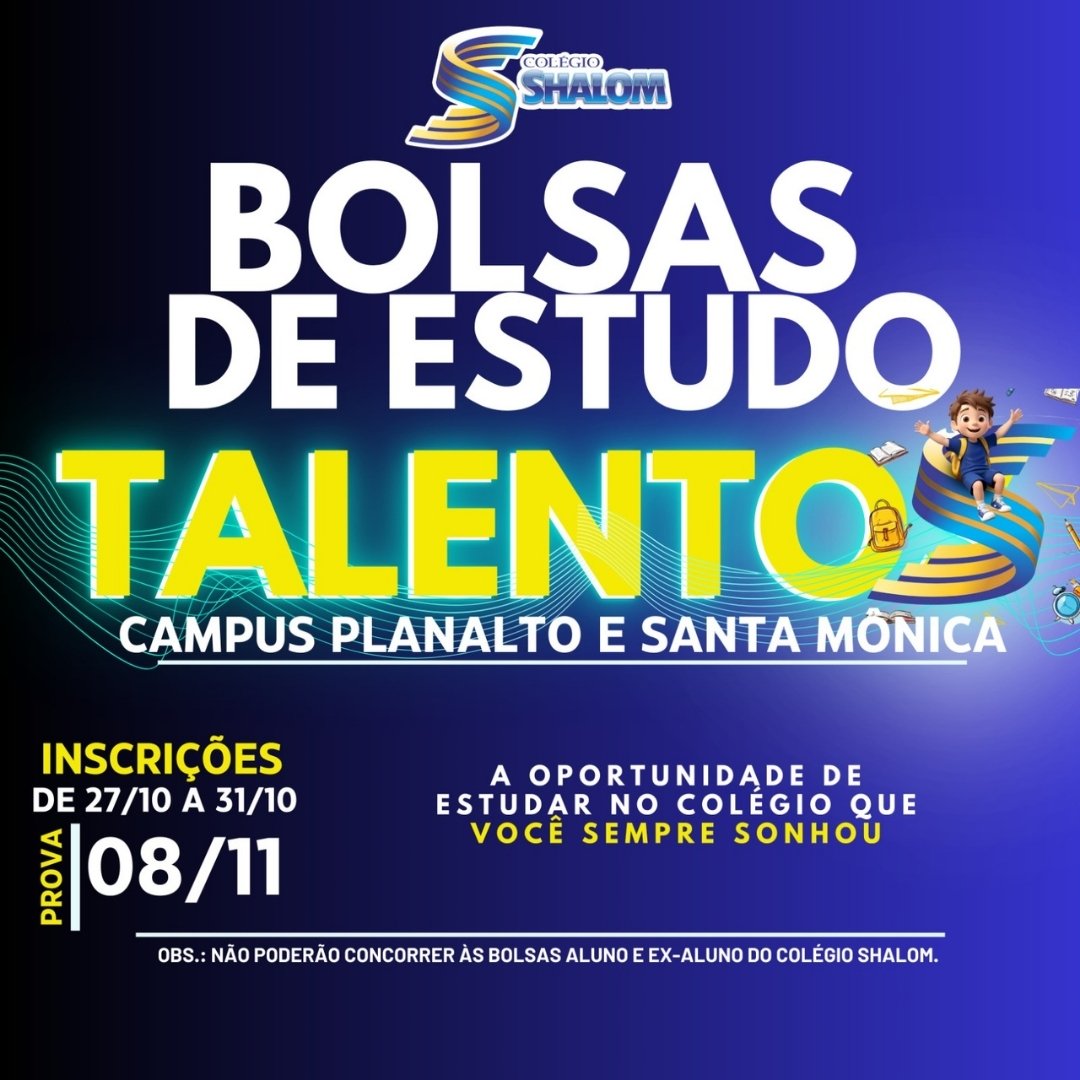 Essa é a oportunidade de estudar no colégio que você sempre sonhou! ✨ O Colégio Shalom está com inscrições abertas para o processo seletivo de bolsas de estudo para estudantes com talento, dedicação e vontade de ir além. Aqui, valorizamos o seu potencial e abrimos portas para um futuro brilhante. 🚀 🗓️ Inscrições: de 27/10 a 31/10 📝 Prova: 08/11 Não perca a chance de fazer parte de um Colégio que tem uma Metodologia de Ensino Avançada aliada à Educação Por Princípios! 🌟 Clique em 👉saiba mais e confira o edital com todas as informações necessárias. Colégio Shalom, mais que uma escola, uma família 💙💛
