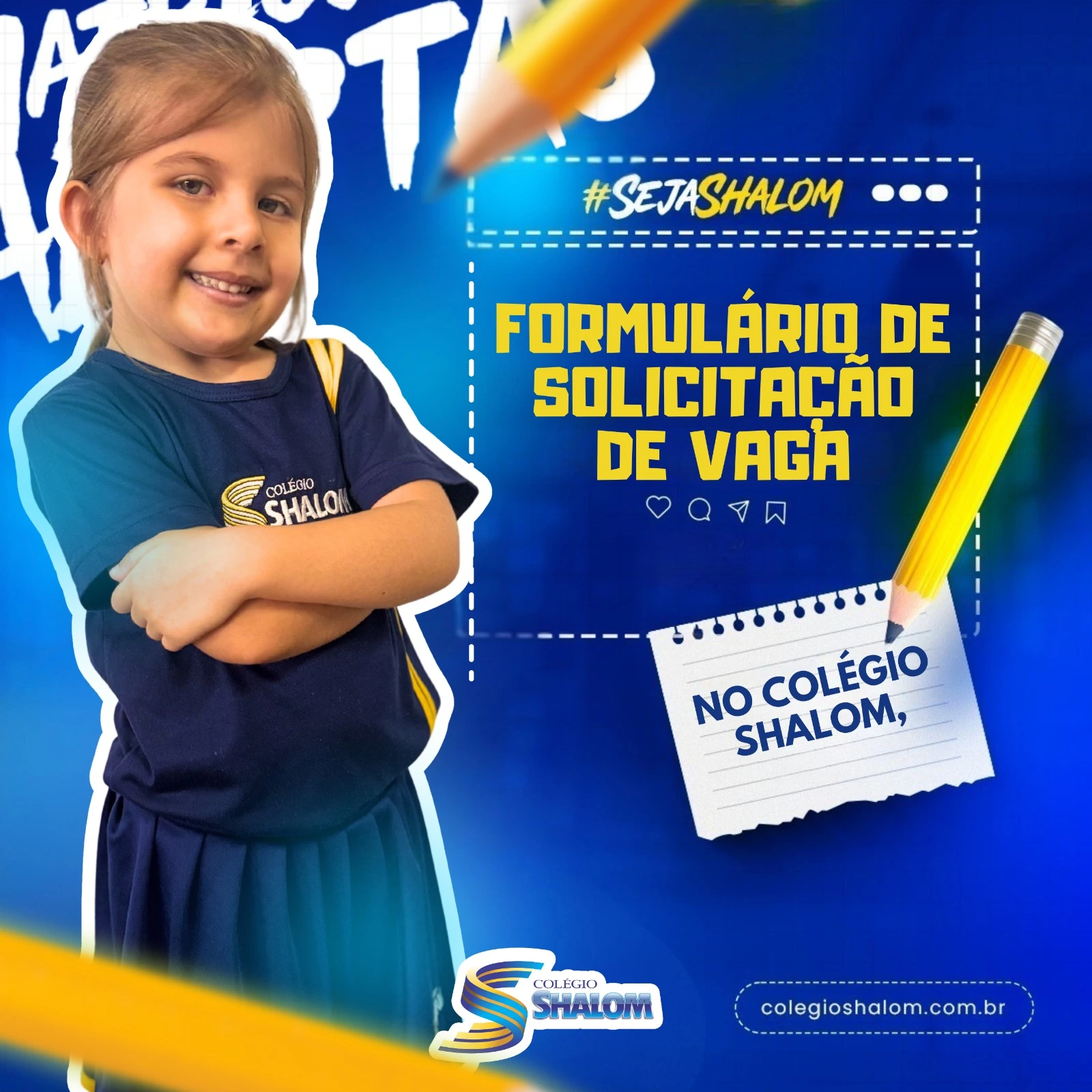 No Colégio Shalom, acreditamos que cada aluno é único e merece um acompanhamento atencioso desde o primeiro contato com a nossa escola. Por isso, disponibilizamos o Formulário de Solicitação de Vaga, um passo importante para que possamos conhecer melhor o estudante e sua família. Por meio dele, conseguimos entender o perfil do aluno, identificar possíveis necessidades específicas e nos preparar para oferecer o suporte adequado, garantindo um ambiente acolhedor, seguro e propício ao desenvolvimento acadêmico e pessoal. Além disso, ao preencher o formulário, os pais também poderão receber informações importantes sobre condições especiais e possíveis descontos, conforme os critérios estabelecidos pela instituição. Nosso objetivo é proporcionar uma experiência educacional de qualidade, alinhada aos valores que fazem do Colégio Shalom um espaço de aprendizado, cuidado e crescimento. 👉 Clique no link, preencha o formulário e dê o primeiro passo para fazer parte da nossa família! Estamos prontos para receber você e seu filho com carinho e dedicação.